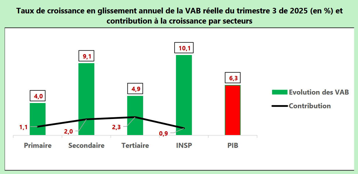 Au troisième trimestre 2025, l’activité économique nationale est demeurée solide. Selon les données officielles publiées par l’INSEED, le produit intérieur brut (PIB) réel a progressé de 6,3 % en glissement annuel, contre 6,5 % à la même période en 2024. Cette légère décélération ne remet pas en cause la tendance générale, qui traduit une consolidation du rythme de croissance. La performance globale repose sur la contribution des trois grands secteurs d’activité. Le secteur primaire enregistre une hausse de 4,0 %, le secondaire affiche une progression remarquable de 9,1 %, tandis que le tertiaire croît de 4,9 %.